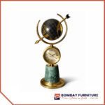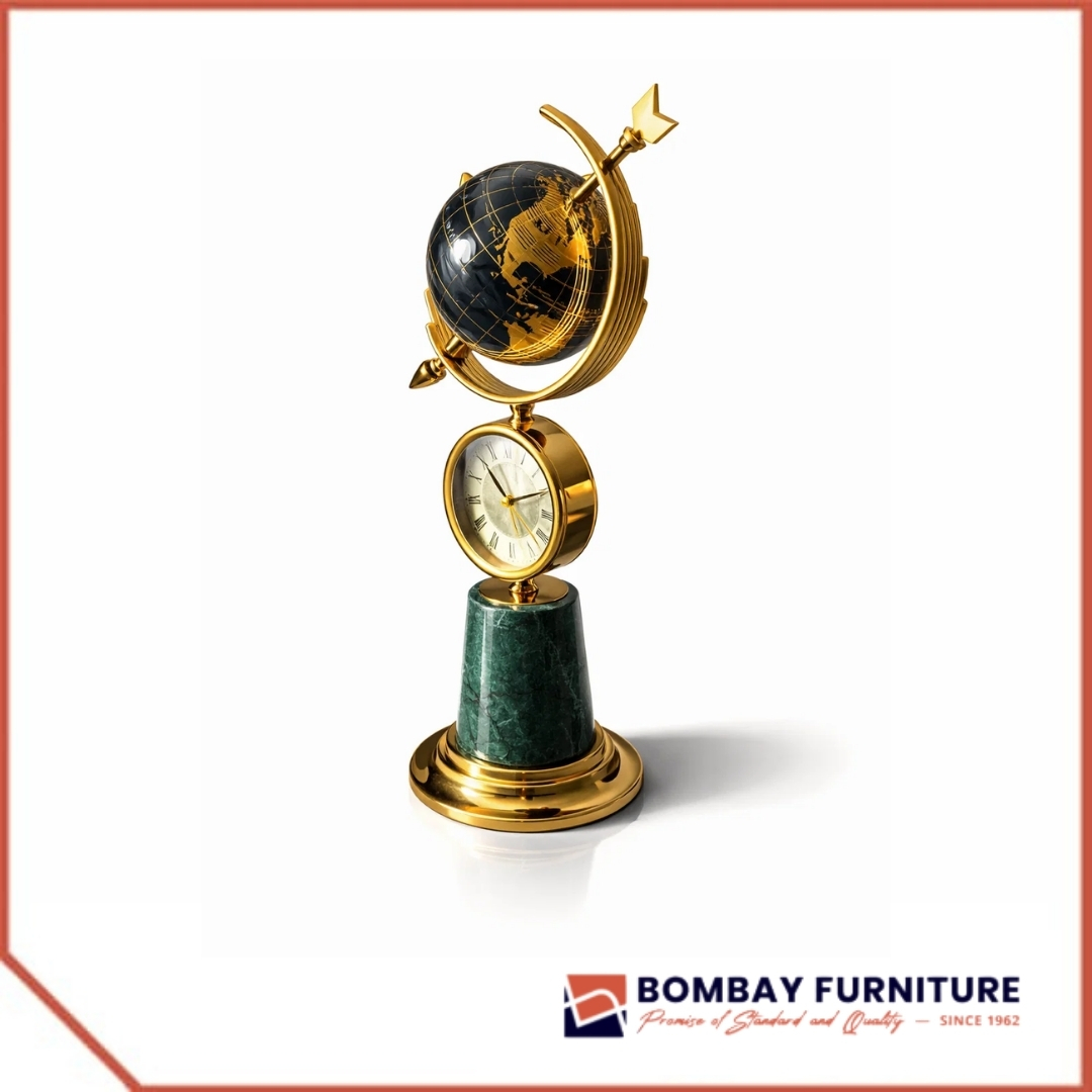 The heart of the piece features a vintage-inspired analog clock, encased in a polished gold frame to track your most pivotal moments. Every detail is anchored by a solid, deep-emerald marble pedestal and a weighted, high-shine gold base. The Equinox is more than a decorative object; it is a signature of success and an essential centerpiece for the refined executive suite.